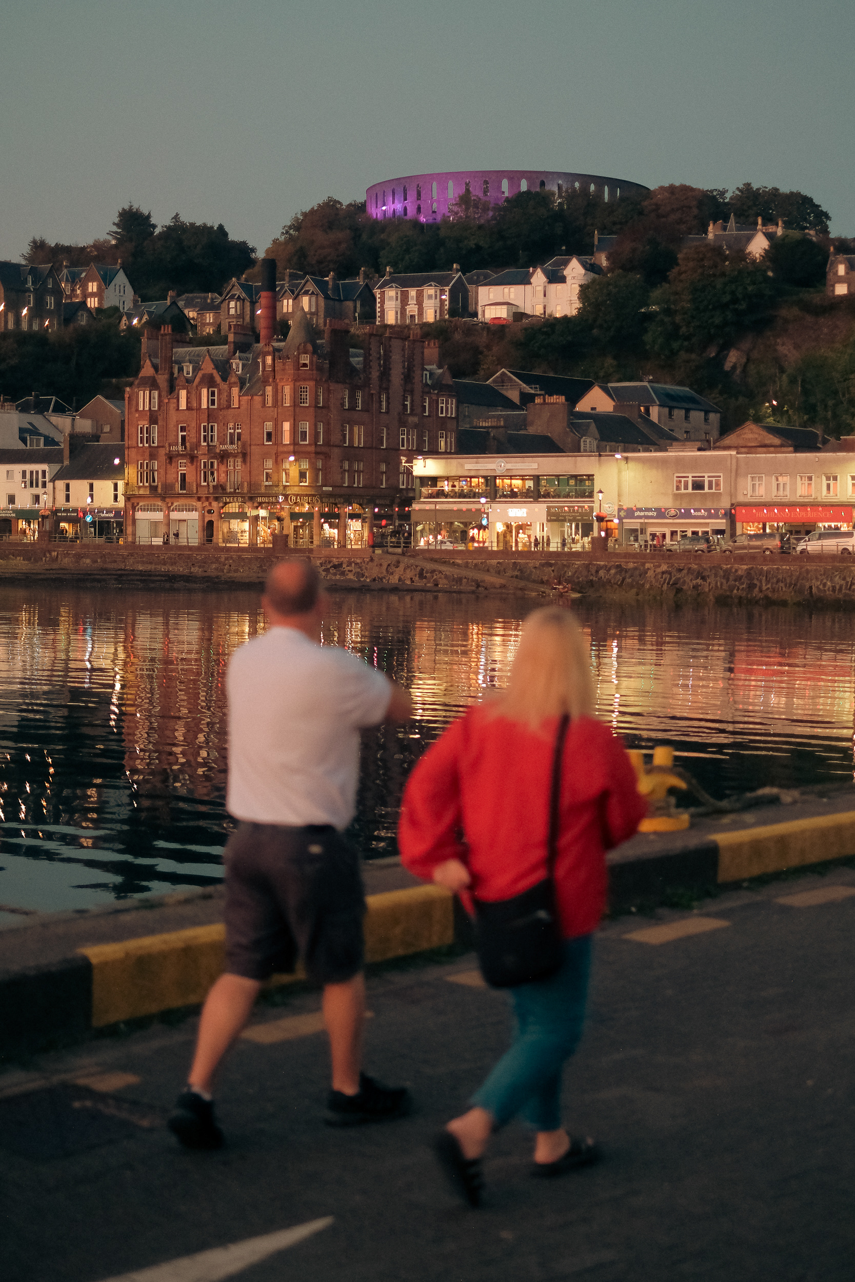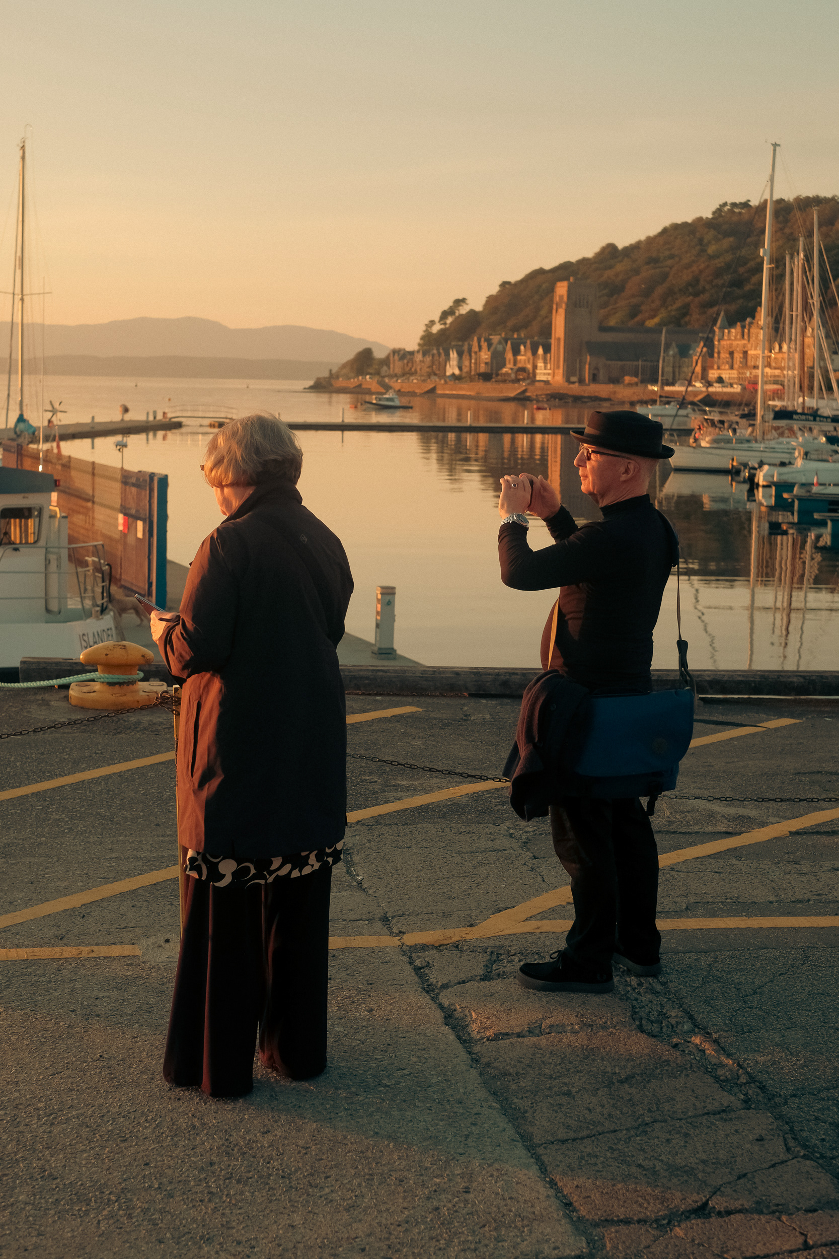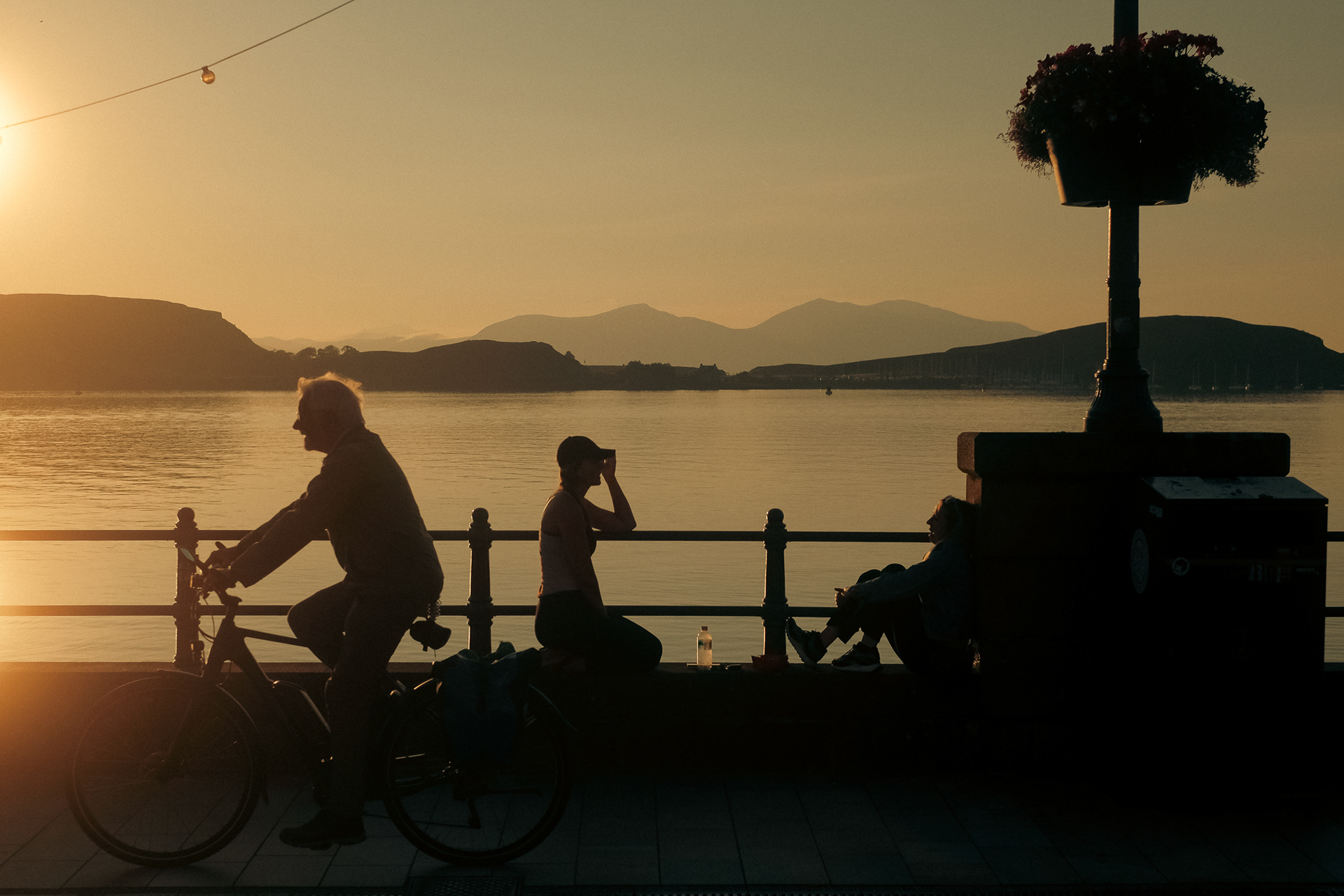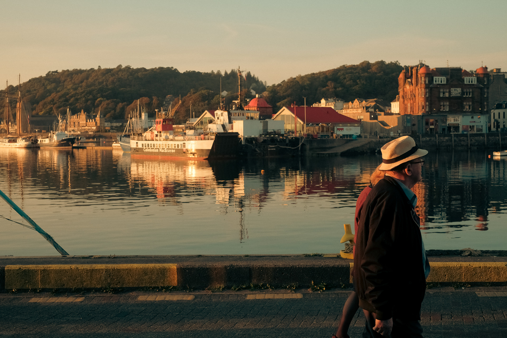 Street photography set taken in the small coastal town of Oban, in the Scottish highlands. Documenting one evening in September 2024. Calmac ferries, views to Mull and people enjoying the golden light.