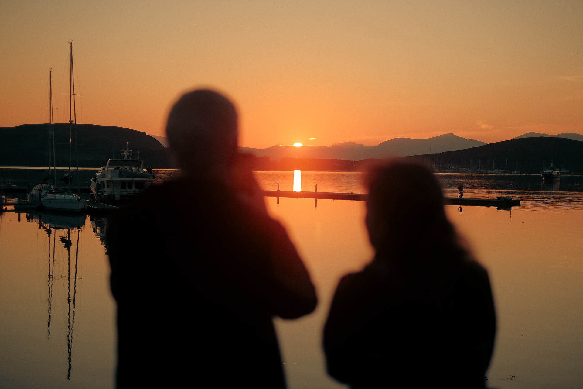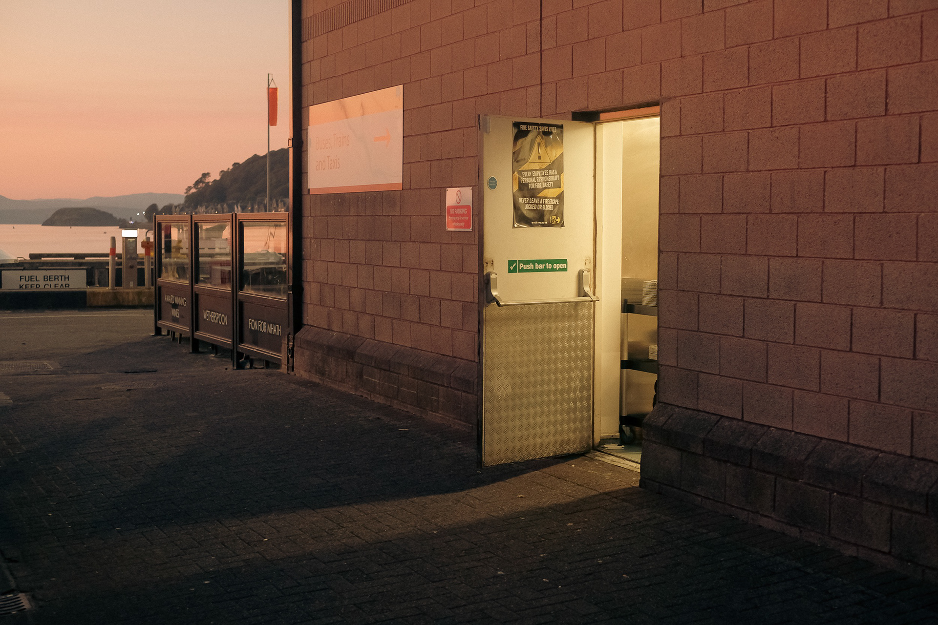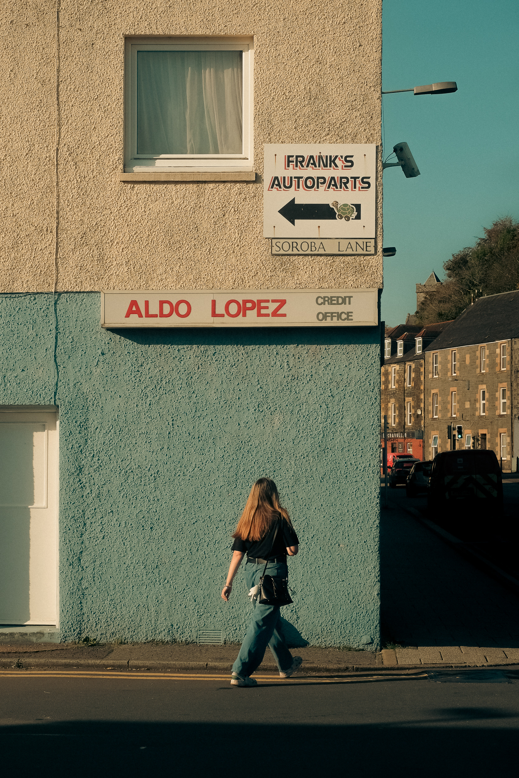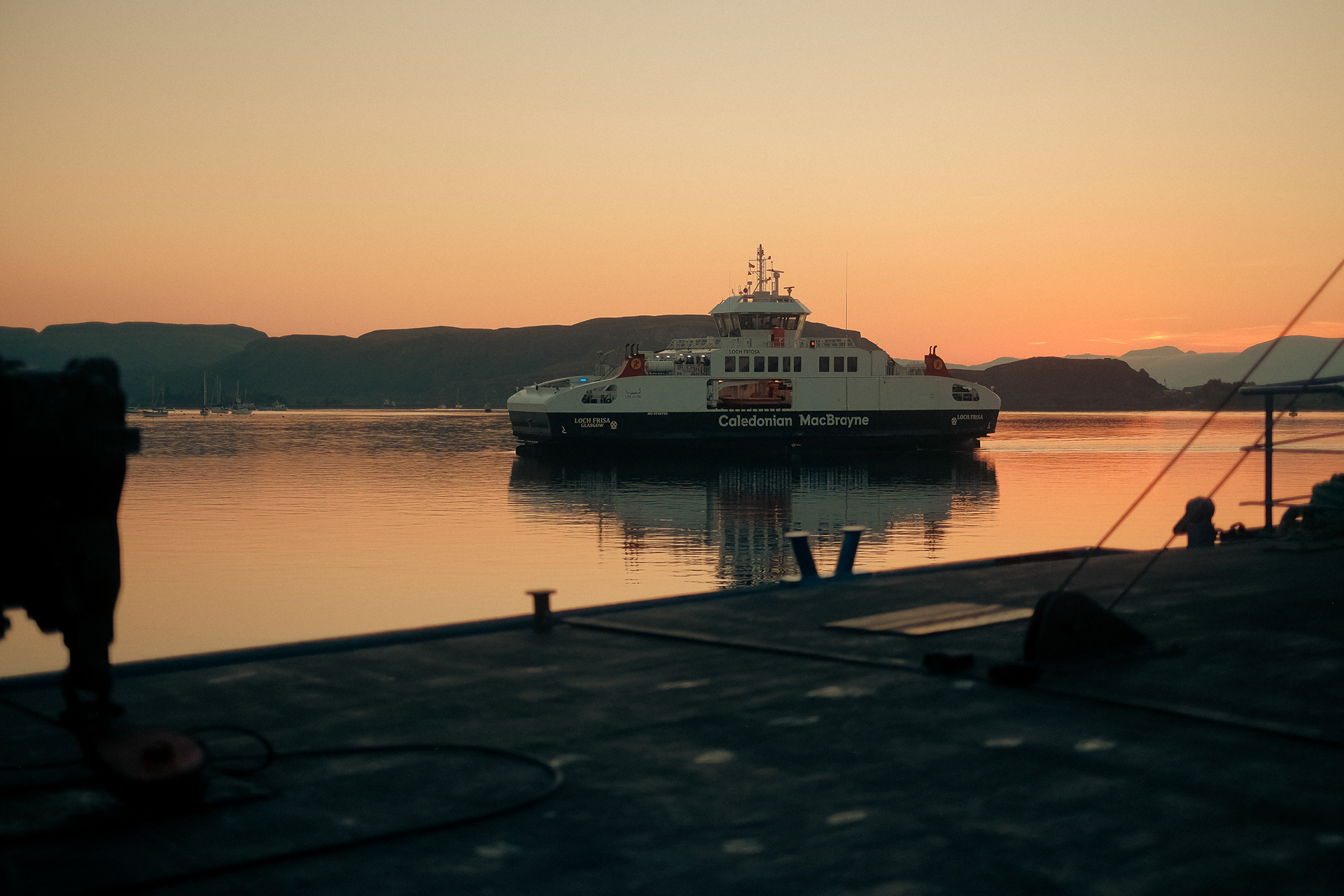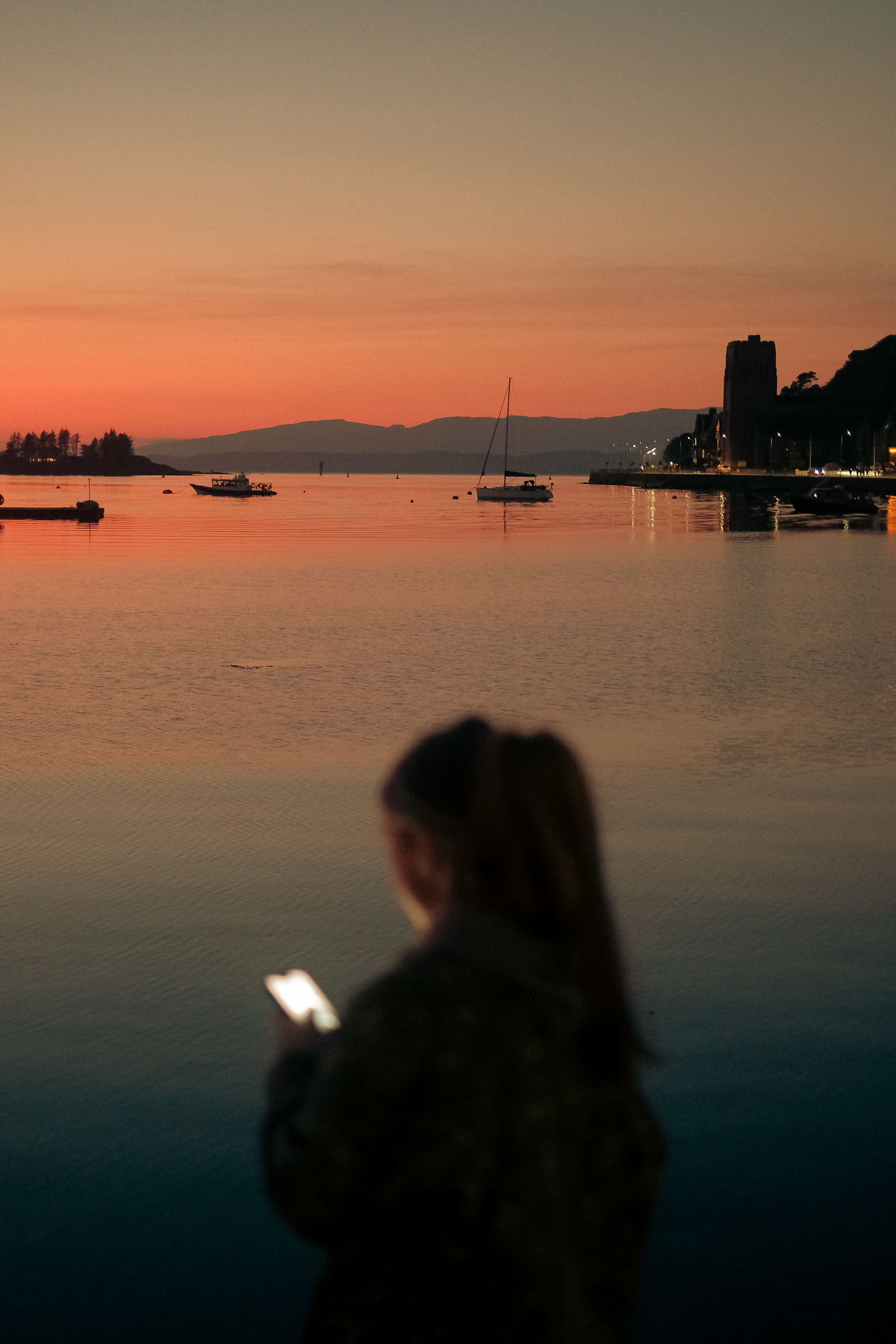 Street photography set taken in the small coastal town of Oban, in the Scottish highlands. Documenting one evening in September 2024. Calmac ferries, views to Mull and people enjoying the golden light.